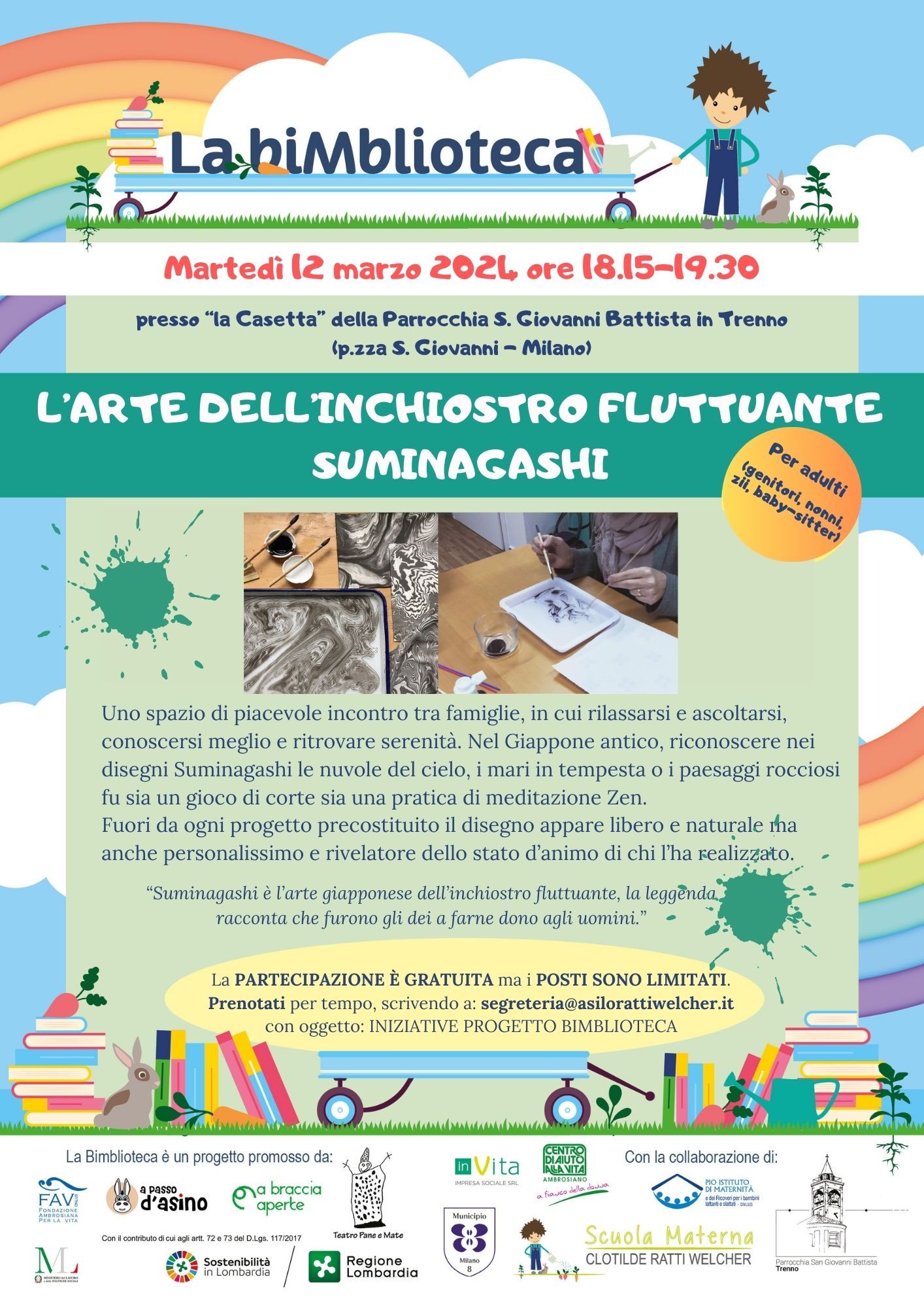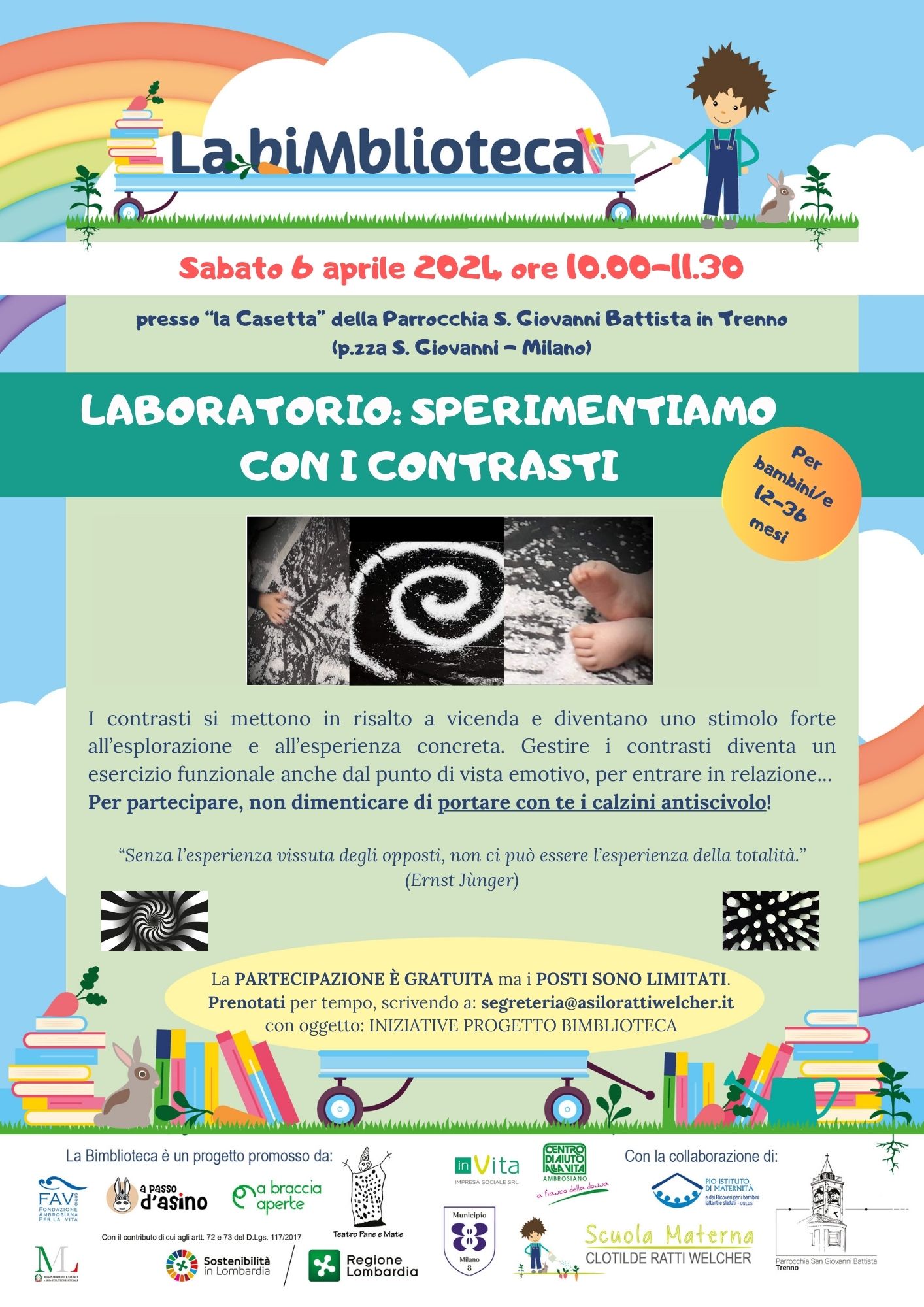 L’idea di una biblioteca specifica per la prima infanzia è da tempo allo studio di questi enti e dell'Associazione Clotilde Ratti Welcher - ETS potrà, in futuro, ospitare definitivamente tale servizio all’interno della sua struttura. Per ora, l’adiacente parrocchia di S. Giovanni Battista in Trenno, metterà a disposizione suoi locali per cominciare e realizzare il servizio. InVita Impresa Sociale, si occuperà della sistemazione degli ambienti e del montaggio degli arredi coinvolgendo anche la componente volontaria di A Braccia Aperte e dei genitori di Clotilde Ratti Welcher ETS. Quest’ultima, comunque, ospiterà un angolo “free library” e metterà a disposizione il suo giardino per la lettura e spettacoli all’aperto, oltre che personale educativo qualificato e promuoverà il servizio presso le famiglie iscritte (28 Nido e 44 Infanzia).
